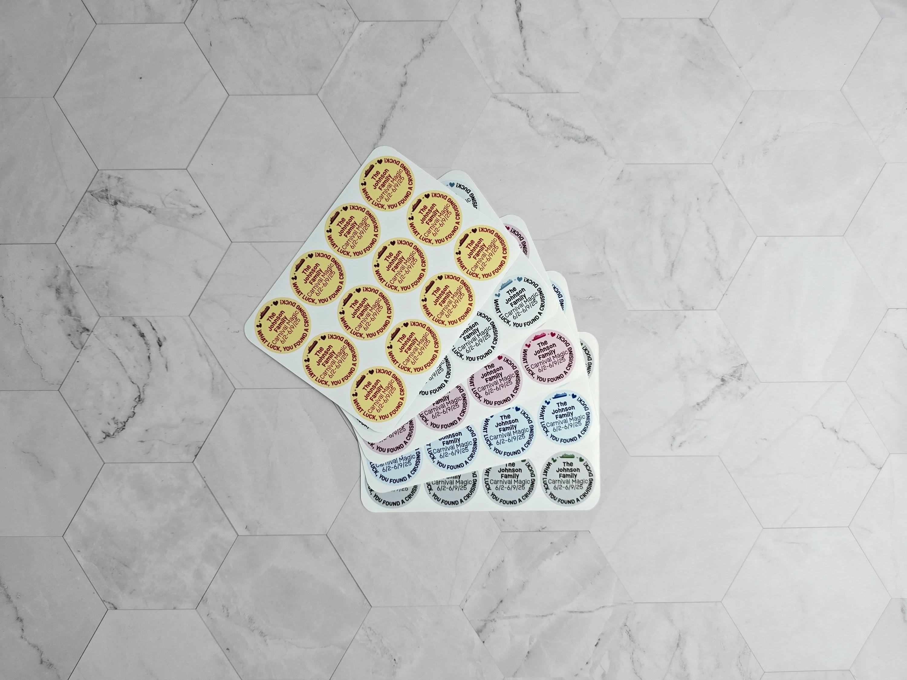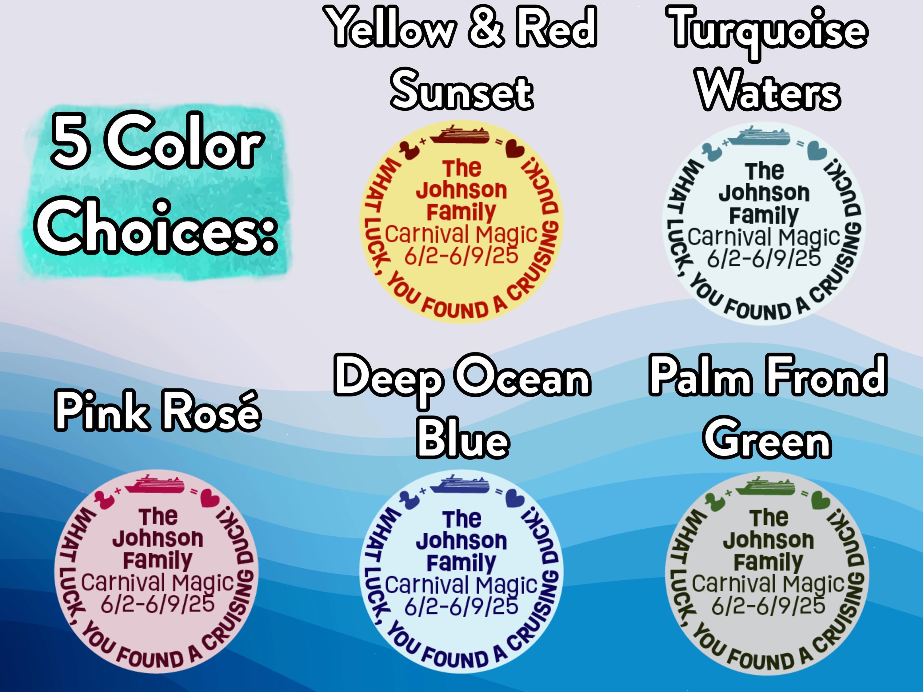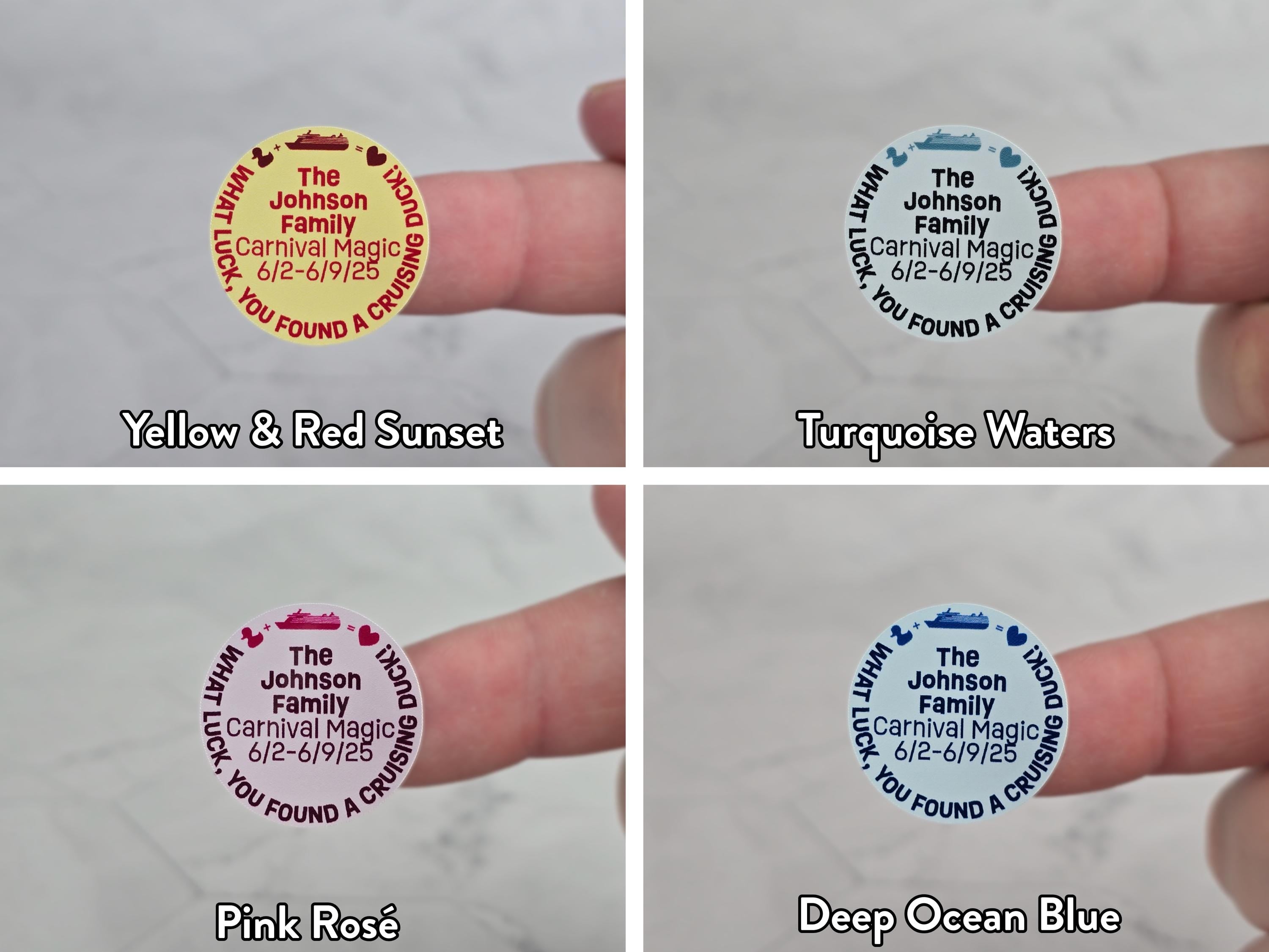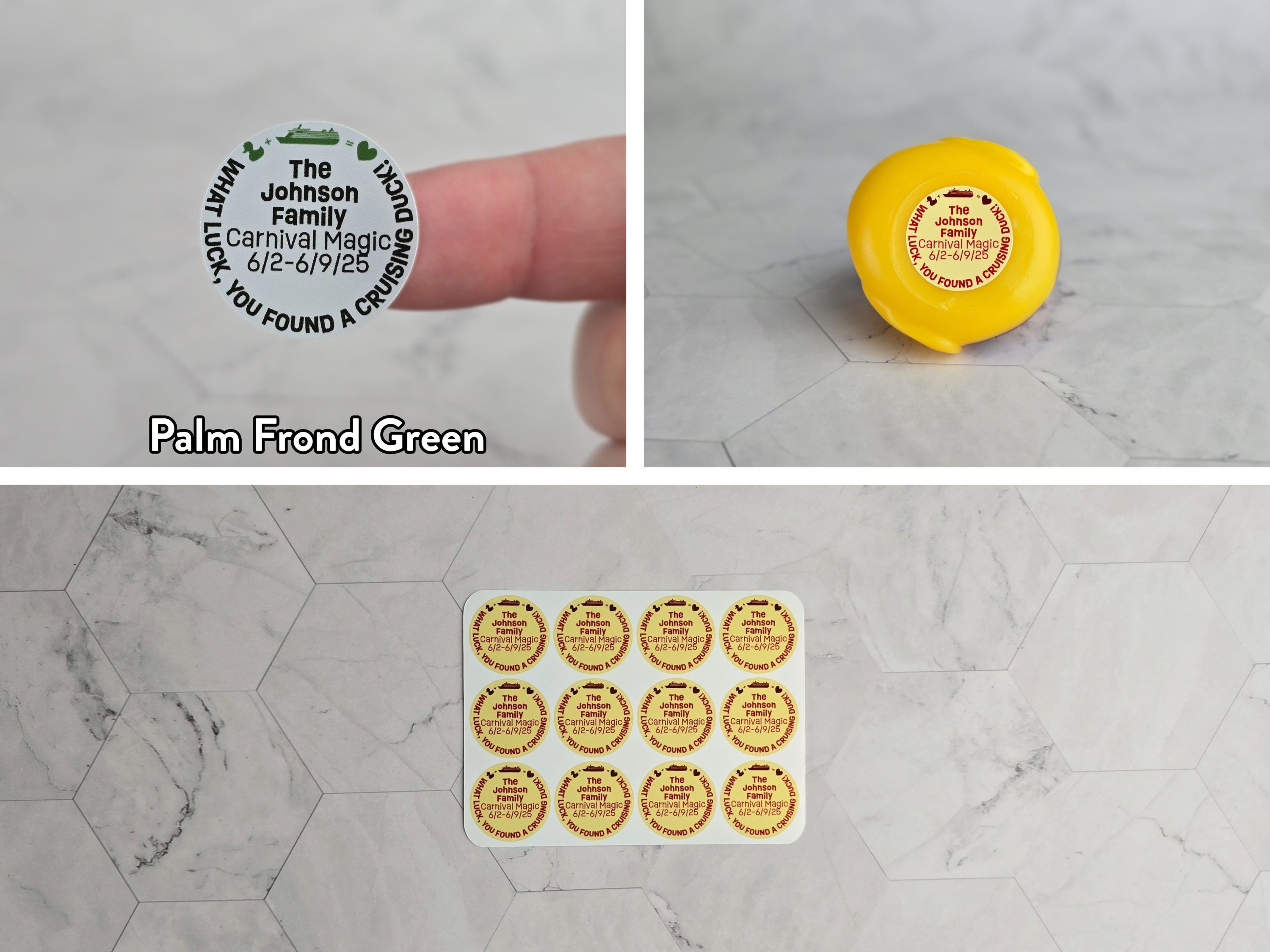 These Duck + Cruise = Heart duck tag decals are a much easier option than traditional duck tags. We customize, print, cut, and ship them to your door. All you have to do is stick them to your ducks! (ducks not included) Your ducks will stand out from the crowd with this cute personalized design! These stickers are designed to be stuck to the bottom of ducks that have a flat bottom of at least 1 1/8 inches (26 MM) in diameter. They can also be stuck to the front or back of the magnet ducks in our shop.